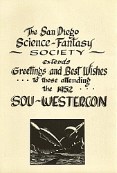The fifth annual Westercon was also known as Sou-westercon and was a two day convention that was held in San Diego, California on June 28 and 29, 1952. The program book came with a souvenir booklet titled "A Cross-Section of Art in Science~Fantasy". The photo-offset printed booklet contains 24 pages and has fifteen examples of science fiction art, including work by Neil Austin, Morris Scott Dollens, Virgil Finlay, Frank R. Paul, Chesley Bonestell, Alexander Leydenfrost, Henry Eichner, and William F. Nolan (two pieces).
