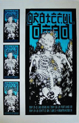 The uncut proof of the poster was created to promote a four-venue Grateful Dead concert in the spring of 1994. The mini tour commenced on May 19 in Las Vegas, stopped in Portland and Seattle and culminated with three shows at the Shoreline Amphitheater in Mountain View, California from June 2-4. The silkscreened, uncut proof sheet was designed by late Alton Kelley. The poster proof measures approx. 22 1/2" x 35"