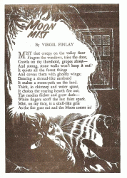 Magira number 28 contains a portfolio / Moon Mist by Virgil Finlay. 'Moon Mist' is a poem of fourteen lines in one stanza.