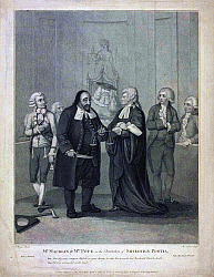 The scene depicts Charles Macklin and Mrs Pope as Shylock and Portia in the 'Trial' scene from 'The Merchant of Venice'. It is an engraving by William Nutter (1790?) after the painting by John Boyne. Ahead of his time, Charles Macklin wears a costume appropriate to the time and place of his character, whereas the other actors wear contemporary garments.