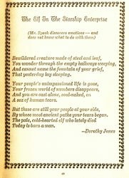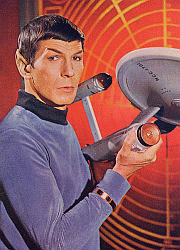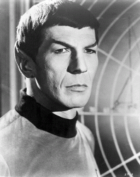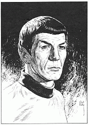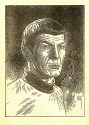 Virgil Finlay drew his pen and ink portrait of Leonard Nimoy as Spock presumably working from a publicity still from an early promotional photoshoot. Judging by the clothes and the wide black collar, the photoshoot is the one that the Site My Startrek Scrapbook places before or after the production of the second pilot, but before the first regular episode was filmed. It seems that the "in-between" design of the custumes with the wide black collar and straight-edged rank stripes on the cuffs were worn only for the publicity stills.