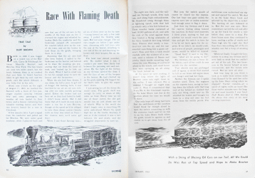 According to A Virgil Finlay Checklist, Virgil Finlay delivered an illustration with the title 'My Race With Burning Oil Cars'. The published drawing illustrates the 'True Tale' article 'Race With Flaming Death' by Duff Brown.