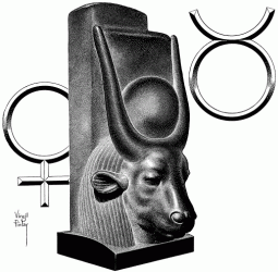'Head of Hathor or Mehetweret', is a New Kingdom, Dynasty 18, sculpture in porphyritic diorite, 53.6 cm heigh. It is on display at the Metropolitan Museum of Art, New York, U.S.A.